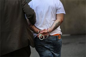 A New York City police officer brings a man to jail. If a court convicts him of a felony, federal law would likely ban him from carrying a gun under most scenarios. Federally speaking, a felony refers to a crime that's punishable by more than a year of prison time. See more gun pictures.