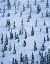 A tiny skier among several Colorado Blue Spruce trees. Could he be looking for the perfect Christmas tree?
